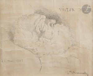 Léon BONNAT (1834-1923). — Dessin original à la plume, signé en bas à droite et daté à gauche « 22 mai 1885 » ; 18 x 25,5 cm. (encadré). — Tête de Victor Hugo sur son lit de mort ; dessin fait en trois heures le jour même de la...
