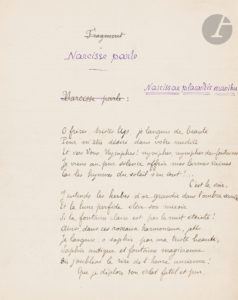 Le manuscrit était intitulé Fragment, et commençait par les mots « Narcisse parle : ». Pierre Louÿs a biffé ces deux lignes et inscrit, à l’encre violette, le titre : Narcisse parle, et a ajouté l’épigraphe : Narcissae placandis manibus, ainsi que le mot : (Fragment) à la fin du poème.