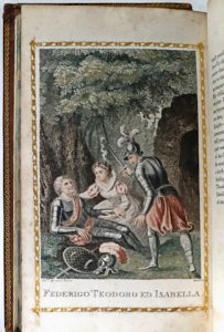 First edition published by Edward Jeffery of this first "Gothic novel" (1st ed. : 1764). Nicely illustrated with 7 engravings coloured with an inking-page (including the frontispiece), encircled by a gilt roll-stamp, by O. Birrel taken from the first Italian illustrated edition published in London by Molini in 1795. Copy on large paper on vellum paper Whitman and with wide margins, sold "Price One Pound Seven Schillings in Boards, with coloured Plates and Borders" (cfr title-page). • Very nice binding, unfortunately soiled, with a fore-edge painting elegantly executed under golding figuring the panorama of a town with a cathedral or abbey with two towers, churches, a mill with a wheel and constructions along a river (i.e. London ?). ^ Première édition donnée par Ed. Jeffery, illustrée de 7 gravures à la poupée (front. inclus). Ex. en grand papier sur vélin Whitman à grandes marges. Rel. anglaise de c. 1810 décorée dans le style Empire avec gouttière finement peinte sous or représentant le panorama d'une ville, notamment avec une cathédrale ou une abbaye (i.e. Londres ?) (lég. bruni, rel. défraìchie).