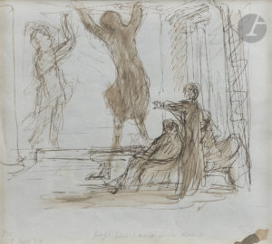 Paul VALÉRY (1871-1945). — Dessin original à la plume et lavis, annoté en bas « P.V. 3 août 29 projet pour l’âme et la danse » ; 21 x 18 cm sur papier bleu (encadré). — Esquisse représentant un trio de musiciens, avec une grande...