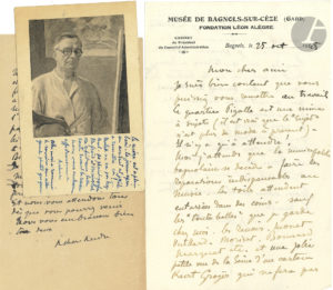 Albert ANDRÉ (1869-1954). — 12 L.A.S., 1943-1952, à Mme Simone Groger (et son mari Kurt Gröger) ; 17 pages la plupart in-8, 2 à en-tête du Musée de Bagnols-sur-Cèze et 2 cartes postales, enveloppes et adresses. Laudun 1er août 1943.