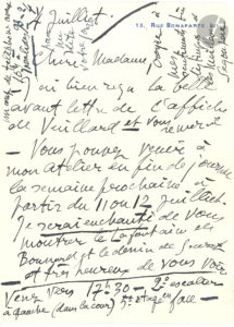 Correspondance amicale à la galeriste : vœux ; félicitations pour son catalogue Hiroshige ; il lui montrera son Bonnard et son Seurat ; déjeuner autour d’une « bouillabaisse tropézienne » ; musée de l’Annonciade à Saint-Tropez ; expositions ; dessin de son « vieil ami Jacques Villon » ; il se réfugie à Saint-Tropez « pour peindre au calme » ; épreuve d’Hokusaï ; etc.