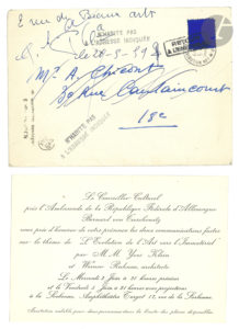 L’enveloppe contenait le carton d’invitation (joint) pour « les deux communications faites sur le thème de l’Évolution de l’Art vers l’Immatériel par MM. Yves Klein et Werner Ruhnau architecte » les 3 et 5 juin 1959 à la Sorbonne.