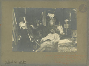 Belle photographie par J. Imbert (17 rue Vavin, Paris), montrant le peintre dans son atelier, assis dans un fauteuil devant son chevalet.