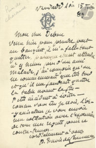 Pierre PUVIS DE CHAVANNES (1824-1898). — L.A.S., 15 février 1889, à Deban ; 1 page in-8 à son chiffre gravé. — « Venu hier pour prendre part au banquet, il m’a fallu tout quitter » pour un ami malade. Il envoie sa cotisation avec ses...