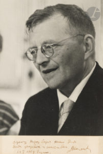 Dmitri CHOSTAKOVITCH (1906-1975). — Photographie avec dédicace autographe signée, 1958 ; photo 29,5 x 23 cm, tirage argentique, encadrée avec P.A.S. de dédicace.