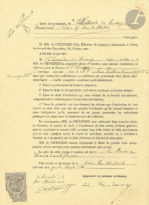 Traité avec les éditeurs de musique MM. de Choudens Fils, à qui M. « A. Debussy », demeurant 27 rue de Berlin à Paris, vend, pour la somme de 200 F, la propriété de trois œuvres pour piano : Ballade Slave, Valse Romantique et Tarentelle Styrienne. Une note signée Choudens précise que l’ensemble a été « rétrocédé à M. Hartmann ».