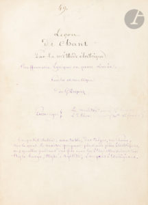 Le n° 49 est le manuscrit autographe signé du livret de la Leçon de Chant par la méthode électrique, Bouffonnerie lyrique, Neuilly 27 janvier 1878 (5 pages).