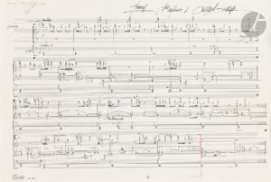 On joint un autre manuscrit autographe signé, esquisse de travail d’une page (131) de son opéra Passion, créé au Festival d’Aix-en-Provence le 29 juin 2008. La page est écrite pour grand orchestre et les deux personnages Lui et Lei qui chante : « Te lo diro il perché »…. La page est notée à l’encre de Chine sur papier Star à 36 lignes, avec des corrections à l’encre rouge et à l’encre violette ; elle compte 4 mesures. Au dos, dédicace : « 1ère esquisse p. 131 de Passion. A Hughes Tenenbaum, Amitiés lyriques […] Pascal Dusapin 2 sept. 2008 ».
