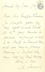 Charles GOUNOD. — L.A.S., 29 janvier 1887, à son éditeur Henry Lemoine ; 1 page in-8. — Il compte passer lundi 31 « pour toucher le premier versement relatif à la Messe de Jeanne d’Arc »…