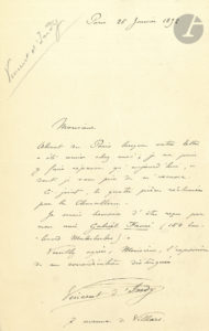 Vincent d’INDY. —L.A.S., Paris, 25 janvier 1892 ; 1 page in-8. Légion d’honneur. Il envoie les papiers réclamés par la Chancellerie et serait « heureux d’être reçu par mon ami Gabriel Fauré (154, boulevard Malesherbes) »…