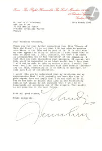 Yehudi MENUHIN (1916-1999). — 2 L.S., Londres 20 [et fin] mars 1966, à Leslie F. Grunberg, d’Artline Films à Levallois-Perret ; 1 page in-4 chaque à son en-tête ; en anglais.