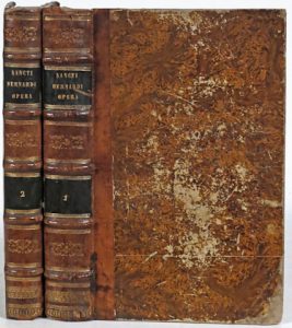 Collection complète des lettres, sermons, travaux ou traités ("Yvoni Cardinali Epist. cxciii", "In Festo Purificationis B. Mariae", "In Festo Sancti Martini Episcopi", "De Consideratione ad Eugenium Papam libri V", "Tractatus de erroribus"...). Suivie au tome VI des oeuvres de Guerric d'lgny (1070/1080-1157), moine cistercien belge et abbé d'lgny, et de Gilbert de Hollande, tous deux dans la continuité de Bernard de Clairvaux. Les six tomes, donnés par Jacobus Melo Hortius (1597 ?-1644), sont précédés par une longue introduction sur la vie et l'oeuvre du Saint et sont suivis de commentaires du prélat Juan Caramuel y Lobkowitz (1606-1682) et de deux index (dont un très détaillé). Bernard de Clairvaux (1090/1091-1153) ajouta à l'austérité cistercienne le mépris de la culture et de toutes activités divertissantes et prêcha pour la Seconde Croisade (11451149) qu'il transposa en Guerre Sainte contre les Cathares. Il fut sanctifié en 1174 et fut nommé Docteur de l'Église en 1180 par Pie VIII. Texte sur deux colonnes et titres (2 en rouge et noir) ornementés de larges vignettes (5 identiques). # pas dans Brunet.