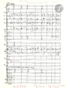 Page extraite de la partition d’orchestre du Livre des Prodiges (1978), numérotée 46 avec le titre Alecto. Elle est dédicacée « Pour Isabelle MO Avec mes meilleurs vœux ». On joint une L.A.S., Paris 6 septembre 1988, remerciant d’un autographe du Pape Jean-Paul, et promettant l’envoi d’une page du Livre des Prodiges (1 p. in-8).