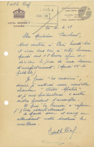 Édith PIAF (1915-1963). — Lettre écrite par Raymond Asso et signée par lui « Edith Piaf », Cannes 4 avril 1938, à Adolphe Borchard ; 1 page in-8 à en-tête Hôtel George V, Cannes (trous de classeur marginaux).