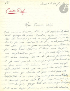 Édith PIAF. — L.A.S « Pupuce », Davos 20 février 1946, à « Mon homme chéri » [Yves Montand] ; 2 pages in-4 à son en-tête (numérotée « 5ème »). — Lettre d’amour à Yves Montand pendant une tournée en Suisse.