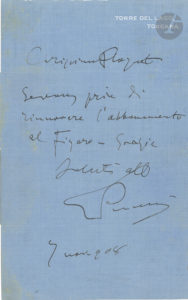 Giacomo PUCCINI. — L.A.S., Torre del Lago 7 novembre 1908, à Louis Floquet, de la maison Ricordi à Paris ; 1 page grand in-8 sur papier bleu, adresse au dos ; en franco-italien. — « Carissimo Floquet Je vous prie di rinnovere...