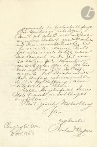 Richard WAGNER. — L.A.S., Penzing près Vienne 21 octobre 1863, [au Kapellmeister Max Seifriz à Löwenberg] ; 2 pages in-8 ; en allemand. — Organisation d’un concert à Löwenberg pour le prince de Hohenzollern-Hechingen.