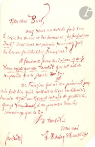 Jules BARBEY D’AUREVILLY. — L.A.S., [1886], à Charles Buet ; 1 page in-8 à l’encre rouge.