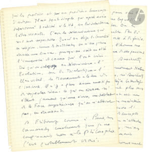 On joint une intéressante L.A.S. de Maurice de GANDILLAC, 30 décembre 1966 (2 p. in-8) : « Nous ne sommes point apparemment sur la voie du retour à l’Être entendu au sens authentique que Heidegger cherche à retourner à travers les poètes. Rien de plus bouffon que la querelle Lacan-Sartre-Althusser-Foucault, et les accusations mutuelles de servir d’alibi à la bourgeoisie (devenue aussi mythique que le peuple depuis que règne souverainement le “On”) »… Plus une L.A.S. de Brice PARAIN relative à une édition de Wittgenstein traduite par P. Klossowski, 4 avril 1955.