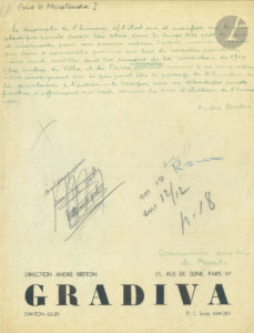 André BRETON (1896-1966). — Manuscrit autographe signé, [Bois de Posada, 1937] ; 1/3 page in-4 à l’encre verte sur papier de la galerie Gradiva.