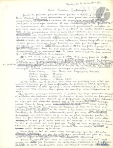 André BRETON (1896-1966). — L.A.S. (minute) « AB », Paris 11 décembre 1951, à Gaston Gallimard ; 2 pages in-4 avec ratures et corrections au verso de papier à en-tête d’Arts.