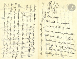 « Candaule ne passera pas avant le 4 mai, mais ne passera pas plus tard que le 6. […] Tout va bien mais certains jours (hier soir par exemple) je suis d’une humeur de suicidé »… Il aura des billets, mais il ne peut les lui envoyer « parce que, hésitant entre divers théâtres, Lugné ne les a pas encore fait imprimer – ; puis il ne se dépêche pas trop de distribuer des places à l’œil pour bien laisser casquer tous ceux qui peuvent ». Gide s’inquiète parce que « aux yeux de la Revue Blanche, je sais bien qu’on n’estime l’auteur qu’à ce qu’il peut faire d’argent »… Il évoque le manuscrit de Bonfils [personnage du 2e roman de Rouart, La Maison du bien-être], pour lequel il a mis des remarques critiques dans la marge…
