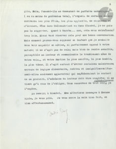Ses rhumatismes l’empêchent de tenir la plume, ce qui explique cette lettre dactylographiée. Il se réjouit de renouer avec Dabit, ayant « beaucoup souffert de ce croquemitaine que votre imagination trop sensible s’était ingéniée à dresser entre nous […] Et je n’osais vous récrire, craignant par quelque nouvelle imprudence d’aggraver votre alarme… Et je mesurais la profondeur de mon affection pour vous, déjà vieille, au chagrin que je ressentais d’avoir perdu la vôtre. […] Notre amitié, d’ordre tout mystique, exige un ciel tout pur ». Gide peine à croire que sa parole « si maladroite, si insuffisante, dont je suis si peu maître dans la conversation, et qui si souvent trahit mes sentiments et ma pensée, que cette parole puisse être d’un réconfort plus grand que mes livres où je tâche de projeter ce que je sens en moi de plus important, de meilleur ». Il n’a pas la même conception du talent : il partage « votre horreur du talent factice, postiche et surajouté ; de la parure, du fard, du masque, fût-il d’or ou de pierreries », et il « repousse de plus en plus tout faire-valoir inutile, toute virtuosité », et tend « à une expression toujours plus pure, plus simple et plus dénuée d’artifices de mes sentiments et de ma pensée ». Cela exige un talent supérieur et une simplicité qui reflète « des vertus profondes, parentes de celles que nous enseigne l’Évangile. Mais fussent-ils au demeurant de parfaits catholiques (ou du moins de prétendus tels), l’orgueil de certains de nos écrivains les plus fêtés, les plus applaudis, me consterne et m’écoeure… ; même dans Chateaubriand ou dans Claudel, je ne puis pas le supporter. Quant à Barrès… non, cela nous entrainerait trop loin »…