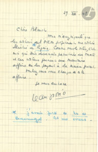 « Vous m’avez signalé que les éditions de l’Odéon projetaient une édition illustrée de Regain. Comme vous le dites, c’est moi qui suis désormais propriétaire des droits et ces éditeurs feraient une mauvaise affaire en les payant à la maison Grasset »… Une note de Blanche Meyer rectifie l’erreur : il s’agissait d’Un de Baumugnes.
