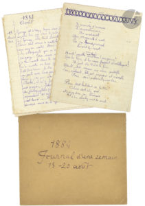 Pierre LOUŸS. — Manuscrit autographe, 1884, Journal d’une semaine, 13-20 aout ; 7 pages petit in-4 (18,5 x 15 cm) tirées d’un cahier, sous enveloppe titrée. Journal intime de jeunesse, à 14 ans, rédigé à l’encre violette sur des...