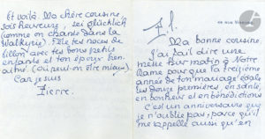 À sa cousine Mme Dubois la félicitant pour son 13e anniversaire de mariage (19 mai 1893, avec quatrain au dos d’un chèque) ; à Edmond Chardon lui rappelant le mariage de Marguerite Maldan le 19 mai 1881 (19 mai 1911 avec le plan de table) ; 2 lettres à sa sœur Lucie : « Ma vue est plus menacée que ma vie. Personne ne parvient à comprendre que j’aie appris à écrire sans voir aucune lettre des mots que je trace » (14 juin 1918) ; à sa cousine Germaine Ponthieu : il travaille sur le Pater de St Luc et St Mathieu ; ses problèmes de vue : il arrive à lire « à la loupe – dix lignes par dix lignes – un livre où les lignes sont espacées » mais « tous les journaux et les lettres à écriture serrée sont indéchiffrables pour moi, dès le vingtième mot ». Plus une petite lettre à Claudine Roland.