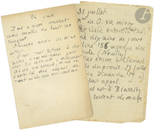 24 juin. « Pas encore ouvert une malle ni fait un paquet. Aucune envie de m’en aller. Écrit trois lettres à des gens pour me renseigner sur les départs, demander aide ou conseil, mais ce sont là des essais de contraintes sur moi-même »… – 5 août. « Départ dans dix ou quinze jours pour Biarritz. Paz quitte Paris dans six jours mais reviendra me voir auparavant. À B. Paz cherchera immédt une petite maison à la campagne et revient me chercher ensuite. Aline revient mardi ». Etc.