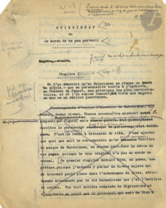 Le tapuscrit, qui compte 19 chapitres, et a servi pour l’impression, est abondamment corrigé, avec de nombreuses additions autographes, interlinéaires ou dans les marges, ou encore par des béquets collés ; de longs passages sont biffés au crayon rouge. Parmi les additions autographes, citons la dédicace inscrite en haut de la première page : « J’aurais voulu te dédier ce livre, mon vieux Cur, si je n’avais craint que trop de gens ne s’obstinassent à te reconnaître. M.R. »