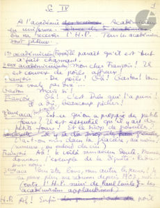 Boris VIAN (1920-1959). — Manuscrit autographe, Sc. IV. À l’Académie ; 2 pages et demie in-4 à l’encre violette (trous de classeur).