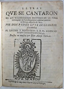 (Liturgie & Cérémonie) - Letras que se cantaron en los solemnissimos maytines de la Pura Concepcion de N. Senora, en la S. Iglesia Catedral de Malaga este ano de 1675. Malaga, Mateo Lopez Hidalgo, 1675. In-4° : [8] pp. Sewed, under grey paper boards.