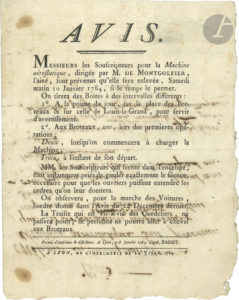 On joint un autre imprimé, Avis au public. Ordre qui sera observé pour la marche des voitures, pendant les deux jours où l’on fera les Expériences du Ballon aérostatique, sous la direction de M. de Montgolfier, l’aîné, Lyon 24 décembre 1783 (Lyon, Imprimerie de la Ville, 1783 ; 3 p. in-4).
