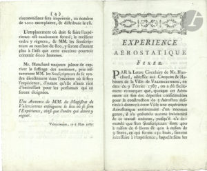 AÉROSTATION. — Imprimé, Expérience aérostatique fixée, Valenciennes 6 mars 1787 ; 4 p. in-8.