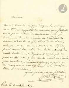 Jean-Baptiste BIOT (1774-1862) mathématicien, physicien et astronome. — L.A.S., Paris 4 octobre 1849 ; 1 page in-12. — Au sujet de ses recherches sur la polarisation de la lumière....
