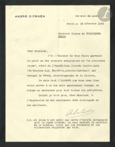 14 décembre 1933, à Pierre de Fouquières. Il lui envoie un exemplaire de La Croisière Jaune, « récit de l’Expédition Citroën Centre-Asie (3e Mission G.M. Haardt-L. Audouin-Dubreui) par Georges Le Fèvre, historiographe de la Mission. Je sais tout l’intérêt que vous avez bien voulu porter à ce dur mais passionnant voyage »...