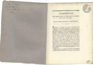 Envoi autographe signé au revers de la couverture : « Monsieur Brongniart, membre de l’Institut, etc. Hommage de profond respect. I.G.S.H. ». Naturaliste et géologue, Alexandre Brongniart (1770-1847) est l’un des fondateurs de la paléontologie stratigraphique ; il effectua aussi quelques travaux de zoologie, notamment sur les reptiles.