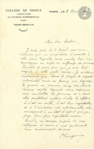 Paul LANGEVIN (1872-1946). — L.A.S., 2 mars 1932, à un Docteur ; 1 page in-8 à en-tête Collège de France. Laboratoire de Physique expérimentale.