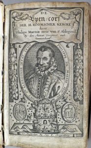 Scherpe allegorische satire tegen de rooms-katholieke kerk (1ste uitg. : 1569) door Marnix van St. Aldegonde (Brussel 1540-1598 Leiden). Deze politieke figuur, o.m. burgemeester van Antwerpen in 1584, was voorbestemd voor een kerkelijk ambt maar bekeerde zich tot het Calvinisme tijdens zijn studie aan de universiteit van Genève. Op de vlucht voor Alva werd hij in Nederland een nauwe medewerker van Willem van Oranje en schreef er zijn beroemde "Bijenkorf" in 1568. Gegraveerde titel met medaillonvormig portret van de auteur (kijkend naar rechts) op de leeftijd van 59 jaar, zijn wapenschild, een bijenkorf en een geïllustreerd citaat uit Apocalyps 3, 20. # Biogr. nat. XIII-800/844; # NNBW I-1307/1312; # Frederiks en Van den Branden 494495. T Satire dirigée contre l'église romaine. Beau titre gravé avec portrait de l'auteur en médaillon (pet. défauts). Plein vélin de l'ép. (défraichi).