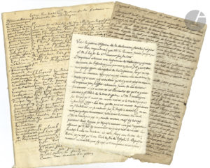 L.A.S. de l’helléniste Louis Dupuy à J. Le Brigant, concernant la querelle de la langue originelle (1780). 4 manuscrits : « Onguent de Pinpon pour les yeux et autres maux » (2 p. in-fol.). – « Extrait d’un traité des vertus de la fontaine médecinalle de Ste Reyne » (cahier de 15 p. in-fol.) ; une note indique que l’auteur en serait le Dr Coutier (†1708) de Vitteaux. – Mémoire scientifique en 154 points (manque le début, nos 1 à 8) sur la pression de l’atmosphère et la composition de l’air. – Nouvelle à la main sur la mort de l’empereur Joseph II et son médecin le Dr Guarin, Vienne 11 février 1790 (1 p. et quart in-4).