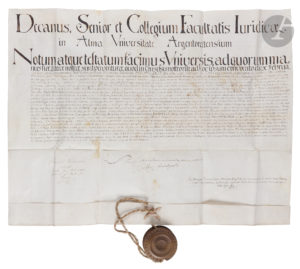 2 diplômes manuscrits, Strasbourg 1739-1747 (parchemins in-plano, grands en-têtes calligraphiés, sceaux de cire rouge de l’Université de Strasbourg, pendant sur cordelette tressée rouge et blanche, dans boîte de buis tourné). Grands diplômes de licencié en droit décernés par l’Université de Strasbourg.