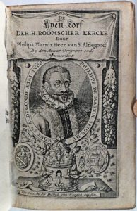 Scherpe allegorische satire tegen de rooms-katholieke kerk (1ste uitg. : 1569) door Marnix van St. Aldegonde (Brussel 1540-1598 Leiden). Deze politieke figuur, o.m. burgemeester van Antwerpen in 1584, was voorbestemd voor een kerkelijk ambt maar bekeerde zich tot het Calvinisme tijdens zijn studie aan de universiteit van Genève. Op de vlucht voor Alva werd hij in Nederland een nauwe medewerker van Willem van Oranje en schreef er zijn beroemde "Bijenkorf" in 1568. Gegraveerde titel met medaillonvormig portret van de auteur (kijkend naar links) op de leeftijd van 59 jaar, zijn wapenschild, een bijenkorf en een geïllustreerd citaat uit Apocalyps 3, 20. # Biogr. nat. XIII-800/844; # NNBW I-1307/1312; # Frederiks en Van den Branden 494495. T Satire against the Roman church by Philippe de Marnix, mayor of Antwerp in 1584 and advisor of William of Orange. Illustrated with an engraved title with the author's portrait (small defects). Contemporary vellum binding.