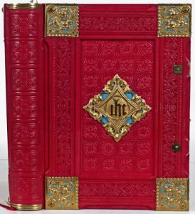Édition de luxe richement ornée dans le style médiéval de bois coloriés avec rehauts d'or : enluminures, lettres, pieds-de-mouche, baguettes. Certaines parties sur papier fort. Relié avec : Missae propriae sanctorum Belgii. Paris, Lethielleux; Tournai, Casterman; Ratisbonae, Fr. Pustet, s.d., gr. in-4°, xxxvi pp. (reliées dans le désordre). ▲ Provenance : Prince Charles et Princesse Sophie de Löwenstein (ex dono ms.); Monseigneur Boone (récipiendaire).
