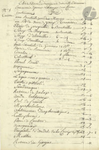 On relève notamment : yeux d’écrevisse, élixir de propriété, sirop de Nerprun, sirop d’absinthe, huile essentielle de genièvre, cinabre, orpiment, tartre vitriolé, résine de jalap, antimoine diaphorétique, emplâtre d’André de la Croix, résine de gayac, emplâtre de cigüe, onguent basilicum, extrait de fumeterre, extrait de chicorée, pilules de cynoglosse, corne de cerf préparée, teinture de cannelle, racine de garance, iris de Florence, racine d’Angélique... À la fin ont été ajoutés, d’une autre main, quelques produits divers : bouteilles, couvertures, rames de papier, etc.