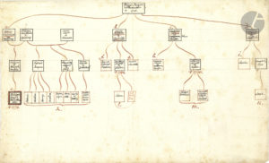 Charte au nom d’Antoine de Bourbon (1587, vélin). Généalogie de la famille von Schmidtburg (Rhénanie 1713), avec armoiries aquarellées. 2 généalogies allemandes XVIIIe s., familles von Buch et Fleckenstein. Lettre avec griffe du ministre de la Marine Forfait (1800). Congé de l’École spéciale de Marine (Toulon août 1815, aigle impériale cancellée), signé par le capitaine Malin. Passeport de la Principauté de Monaco, signé par le chevalier de Villarey (1838).