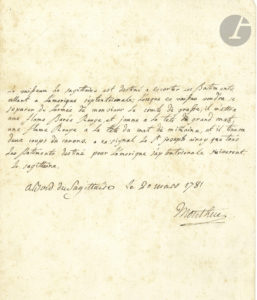 Charles-François de La BOURDONNAYE, Chevalier de MONTLUC (1746-1802) Capitaine de vaisseau, membre des Cincinnati, il participa à la Guerre d’Indépendance américaine. P.A.S., à bord du Sagittaire 20 mars 1781 ; demi-page in-8. — Départ du...
