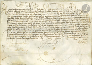 et initiales ornées sur la première ligne, en liasse à la suite d’un cahier sur parchemin de l’official de Paris (22 pages in-fol.) et d’un autre document sur papier (4 pages in-4) ; la bulle (sans le sceau) en latin, le reste en français.